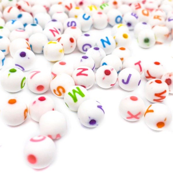 - Modelo y Color: Bolitas blancas con letras colores